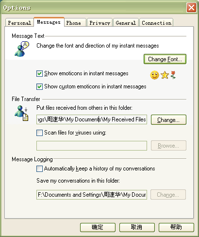 Messenger 6.0必須在個人選項中進行設(shè)置后才可以自動保存聊天記錄,默認(rèn)是不支持的。