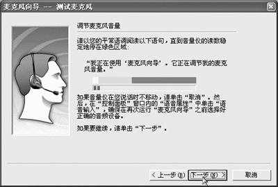 待音量儀式穩(wěn)定后,點擊“下一步”測試麥克風的安放位置,再次朗讀對話框中的例句,然后聽一下回放的錄音是否清晰。一切調(diào)整好后,點擊“完成”。