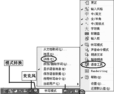 如果您以后想再次進行語音訓練,那么,可以點擊語言欄上的“語音工具”按鈕,然后單擊“訓練”來對計算機進行語音識別的訓練(如圖3)。
