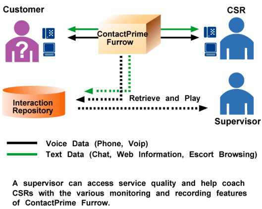 ContactPrime Furrow提供一套簡單易用的度量工具以幫助呼叫中心管理員公正準(zhǔn)確的評估CSR的業(yè)績。管理員可以監(jiān)視CSR與客戶現(xiàn)場的交互過程(語音與數(shù)據(jù)),或者瀏覽記錄的事件,以有效的評估服務(wù)質(zhì)量。