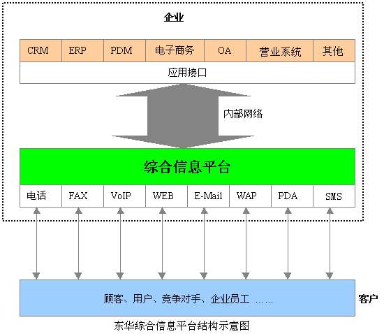 東華集團(tuán)綜合信息平臺系統(tǒng)可集中企業(yè)客戶服務(wù)的優(yōu)勢資源,采用人工業(yè)務(wù)代表服務(wù)與自動語音服務(wù)相結(jié)合的形式,通過電話、Email、Web、尋呼、IP電話/傳真、視頻、段消息等接入方式和服務(wù)手段,向客戶提供業(yè)務(wù)受理、信息查詢、商品定購服務(wù),以及接受客戶的咨詢、建議及投訴,也可以通過主動撥出做社會調(diào)查、市場調(diào)查、商品直銷及資費欠費催繳等。