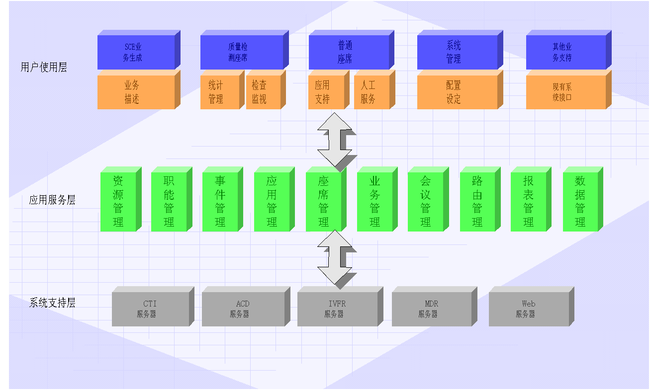 采用功能分散,統(tǒng)一管理的設(shè)計(jì)模式。各組件功能相對獨(dú)立,分布式處理各項(xiàng)事務(wù),它們的有機(jī)結(jié)合實(shí)現(xiàn)了功能完善的ACD服務(wù)器。各組件的預(yù)留接口提供了功能擴(kuò)充的有效途徑。功能包括: