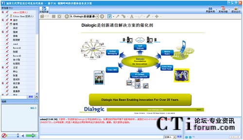 期間,Dialogic還以互動方式講解了3G IVVR與3G多媒體IP呼叫中心的業(yè)務(wù)及方案,并對基于3G視頻呼叫的視頻監(jiān)控業(yè)務(wù)進(jìn)行現(xiàn)場演示,并就時下Dialogic技術(shù)趨勢與觀眾進(jìn)行了互動。參與此次網(wǎng)絡(luò)研討會的參與者近百人,涉及多家網(wǎng)絡(luò)運營商、設(shè)備制造商、增值分銷商、系統(tǒng)集成商。