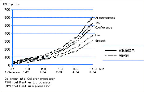 圖1顯示了主要的通信媒體處理功能的實驗測量結(jié)果和預(yù)期性能。Intel 編制的HMP軟件,在Intel的從566 MHz 到 2 GHz的Celeron和 Pentium 處理器上,已經(jīng)對語音宣告、IVR和會議算法完成了實現(xiàn)、優(yōu)化和測試。圖1中的實線表示實驗室中的測試結(jié)果。Intel的目標(biāo)是實現(xiàn)這些算法,并擴展到更高速的Intel Pentium處理器,雙路、四路、甚至八路Intel Pentium處理器、Intel Xeon處理器以及Intel Itanium處理器。圖1中的虛線顯示了Intel所期望的在未來的實現(xiàn)中將得到的結(jié)果。目前,HMP的版本主要以Windows為主,很快就會推出Linux版本。從根本上說,HMP最適合用在純IP的環(huán)境,也可通過擴展到多個服務(wù)器實現(xiàn)密度的提升。