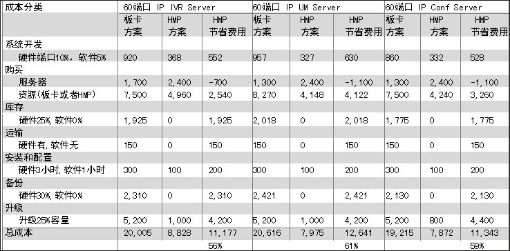 在眾多好處當(dāng)中,對用戶最有吸引力的無疑是節(jié)省成本。張怡國特別強調(diào),對一個應(yīng)用系統(tǒng)而言,成本的計算不應(yīng)該單以產(chǎn)品端口購買價格考核,而應(yīng)該是系統(tǒng)總的建設(shè)成本,包括產(chǎn)品購買成本、服務(wù)器成本、運輸、安裝、庫存、升級等多項費用。基于HMP1.1版本,張怡國作了一個比較,以60端口IP IVR 60、端口IP UM或者60路會議為例,和語音板卡處理方式相比,基于HMP軟件實現(xiàn)能有近60%的成本節(jié)省,其中采購能節(jié)省20%,庫存節(jié)省20%,備份節(jié)省20%,升級節(jié)省近40%。