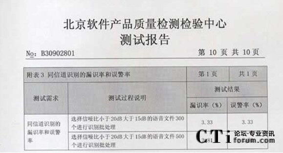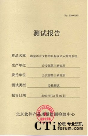 CTI論壇(ctiforum)06月25日消息: 2009年3月02-10日:北京軟件產(chǎn)品質(zhì)量檢測檢驗中心對《海量語音文件的目標(biāo)說話人篩選系統(tǒng)》進行了全面測試包括用戶文檔、功能性、可靠性、易用性、可維護性等多個特性。測試結(jié)果表明《海量語音文件的目標(biāo)說話 2009年3月02-10日,北京軟件產(chǎn)品質(zhì)量檢測檢驗中心對《海量語音文件的目標(biāo)說話人篩選系統(tǒng)》進行了全面人篩選系統(tǒng)》滿足軟件相關(guān)國家標(biāo)準(zhǔn)中的要求,系統(tǒng)在模擬測試環(huán)境中運行正常、穩(wěn)定,正式通過北京軟件產(chǎn)品質(zhì)量檢測檢驗中心的嚴(yán)格測試,系統(tǒng)的漏識率和誤警率分別達到了2.81%和 2.81%。