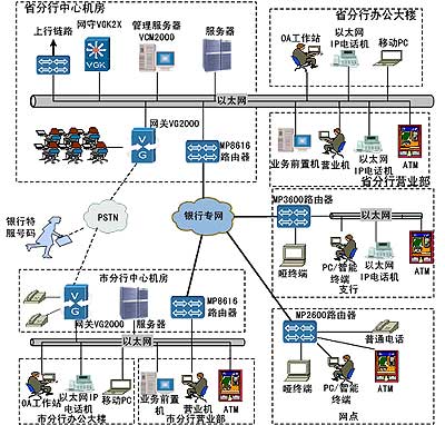 VG2000 IP電話語音網(wǎng)關(guān),支行采用以太網(wǎng)IP數(shù)字電話機,網(wǎng)點則根據(jù)需要可以采用IP數(shù)字電話機或普通電話機。只要網(wǎng)點安裝的路由器是MP2600/2500產(chǎn)品,就可以通過在路由器上加裝IP電話模塊,直接實現(xiàn)普通電話機的IP話音接入。