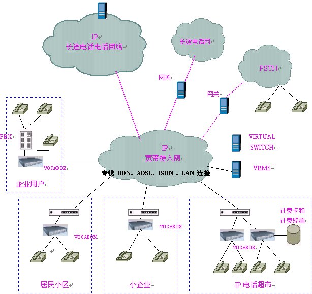 ISP及寬帶網(wǎng)絡(luò)運(yùn)營商的本地電話接入網(wǎng)絡(luò),采用單級(jí)單域結(jié)構(gòu),在網(wǎng)內(nèi)安裝VIRTUALSWITCH虛擬交換系統(tǒng),它作為整個(gè)本地電話接入網(wǎng)絡(luò)的網(wǎng)守,以集中方式管理域內(nèi)的所有網(wǎng)關(guān)(VOCA-BOX),執(zhí)行地址翻譯,呼叫控制,帶寬管理,域管理等功能以及呼叫建立、拆除控制和呼叫管理等功能。在網(wǎng)內(nèi)安裝后臺(tái)計(jì)費(fèi)、認(rèn)證系統(tǒng)(VBMS),對(duì)各個(gè)語音終端實(shí)現(xiàn)計(jì)費(fèi)認(rèn)證及結(jié)算,同時(shí)完成號(hào)碼分配及網(wǎng)絡(luò)管理的功能。