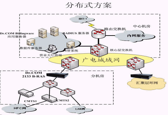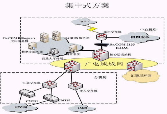 根據(jù)廣電城域網(wǎng)目前網(wǎng)絡(luò)的規(guī)模,以及以后的擴(kuò)展,采用集中接入認(rèn)證與計(jì)費(fèi),統(tǒng)一管理的方案,集中接入指:接入服務(wù)器部署在各個(gè)匯聚層的匯聚點(diǎn),即在網(wǎng)絡(luò)出口安裝寬帶接入服務(wù)器,由寬帶接入服務(wù)器對(duì)所有用戶進(jìn)行身份認(rèn)證、接入控制、實(shí)時(shí)計(jì)費(fèi)、數(shù)據(jù)采集,并將賬單和訪問日志等傳送至綜合業(yè)務(wù)系統(tǒng)。統(tǒng)一管理指在中心機(jī)房就可以進(jìn)行全部的管理,包括:網(wǎng)絡(luò)設(shè)備管理;用戶管理;經(jīng)營策略管理;賬務(wù)管理;安全管理;數(shù)據(jù)分析。提供完整的用戶資料分析,使用習(xí)慣分析,運(yùn)營統(tǒng)計(jì)等詳細(xì)分析報(bào)表。