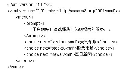 下面是一個(gè)VoiceXML的簡單例子。當(dāng)用戶與電話語音系統(tǒng)接通以后,將會(huì)聽到語音合成的提示信息"用戶您好!請(qǐng)選擇我們?yōu)槟峁┑姆⻊?wù):"。當(dāng)用戶說"股票市場(chǎng)",語音瀏覽器就會(huì)通過語音識(shí)別功能識(shí)別用戶的選擇,然后把對(duì)話流程轉(zhuǎn)向另一個(gè)VoiceXML腳本文件stocks.vxml。stocks.vxml腳本文件則是一個(gè)專門向用戶提供股票市場(chǎng)相關(guān)服務(wù)的語音網(wǎng)頁。