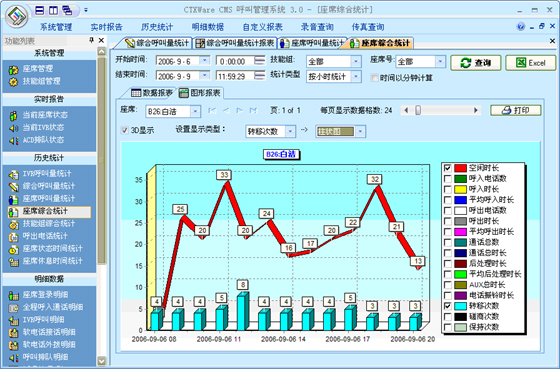 座席綜合統(tǒng)計(jì):可以根據(jù)“月份”、“天”、“小時(shí)”來統(tǒng)計(jì)每一個(gè)座席的綜合指標(biāo)。統(tǒng)計(jì)的指標(biāo)包括:總登錄時(shí)長、空閑時(shí)長、呼入電話數(shù)、呼入時(shí)長、平均呼入時(shí)長、呼出電話數(shù)、呼出時(shí)長、平均呼出時(shí)長、通話總數(shù)、通話總時(shí)長、后處理時(shí)長、平均后處理時(shí)長、AUX總時(shí)長、電話振鈴時(shí)長、平均振鈴時(shí)長、轉(zhuǎn)移次數(shù)、磋商次數(shù)、保持次數(shù)、平均保持時(shí)長。