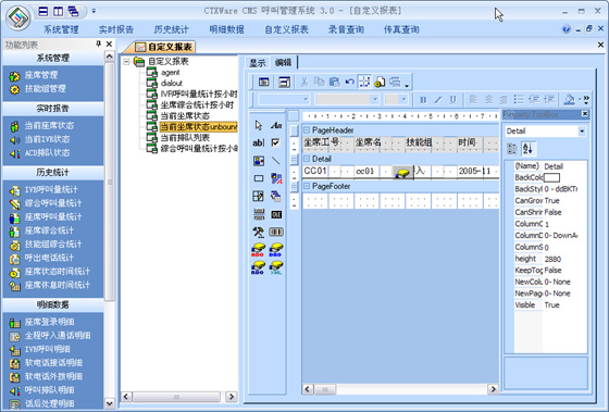 CMS是有效的對(duì)呼叫中心進(jìn)行監(jiān)視和管理的系統(tǒng)。它可以實(shí)時(shí)監(jiān)控整個(gè)呼叫中心的當(dāng)前數(shù)據(jù),按照座席、技能組、中繼線、隊(duì)列、路由進(jìn)行監(jiān)視,查看座席服務(wù)狀態(tài)及接通率各種指標(biāo),通過各項(xiàng)實(shí)時(shí)記錄和歷史記錄向用戶提供多種綜合分析報(bào)告和統(tǒng)計(jì)報(bào)告。其所生成的上百張報(bào)表,可以協(xié)助企業(yè)有效管理資源,檢查成本,預(yù)測改善現(xiàn)有運(yùn)作的潛在需求。并提供圖表顯示,生成Excel文檔進(jìn)行再編輯,或者通過標(biāo)準(zhǔn)的報(bào)表形式進(jìn)行編輯。支持自定義報(bào)表。