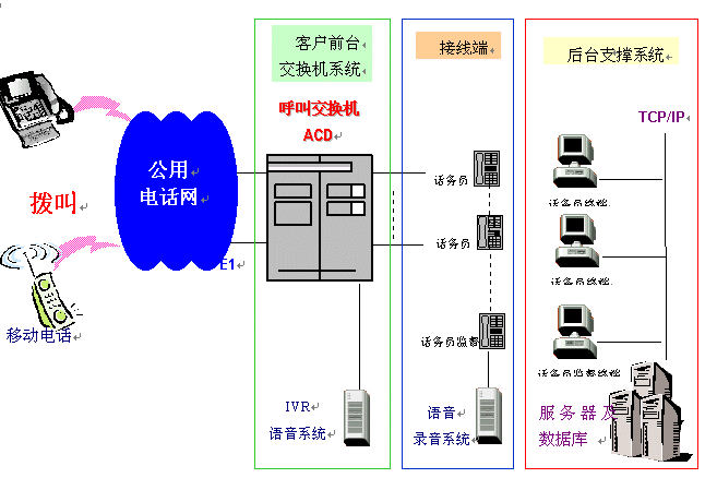 一個完整的呼叫中心解決方案通常由以下核心部分組成:自動呼叫分配(ACD)、交互式語音應答(IVR)、計算機電話綜合應用(CTI)、錄音服務器、呼叫管理(CMS)等。