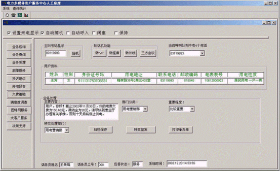 。。提供電話、傳真、電子郵件、因特網(wǎng)、手機(jī)、網(wǎng)絡(luò)電話等多種通訊方式接入和呼出,全天候24小時服務(wù);無論以何種方式接入系統(tǒng),都可以用統(tǒng)一的方式進(jìn)行后臺處理,全面體貼居民的需要,有效擴(kuò)大電力系統(tǒng)的服務(wù)范圍!