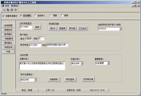 。。博宇公司醫(yī)院客戶服務中心系統(tǒng)將醫(yī)院內分屬各科室為病人提供的服務,集中在一個統(tǒng)一的對外聯(lián)系“窗口”;系統(tǒng)認真處理每次客戶呼叫,并提供智能路由選擇、電話外撥、預計客戶等待時間、屏幕彈出、呼叫和客戶數(shù)據(jù)以及操作界面同步轉移、因特網(wǎng)服務等先進功能,讓患者感受到高質量的服務,大大提高醫(yī)院的響應速度和形象。同時還實現(xiàn)病人信息的集中管理,提供業(yè)務統(tǒng)計和呼叫統(tǒng)計分析等功能,通過客戶的相關信息為患者提供個性化服務,確保每個呼叫的處理都能滿足病人的特定需求,同時能自動對所有客戶的呼入過程及操作內容進行量化處理,生成報表,作為管理依據(jù),以幫助醫(yī)院領導實現(xiàn)決策分析。