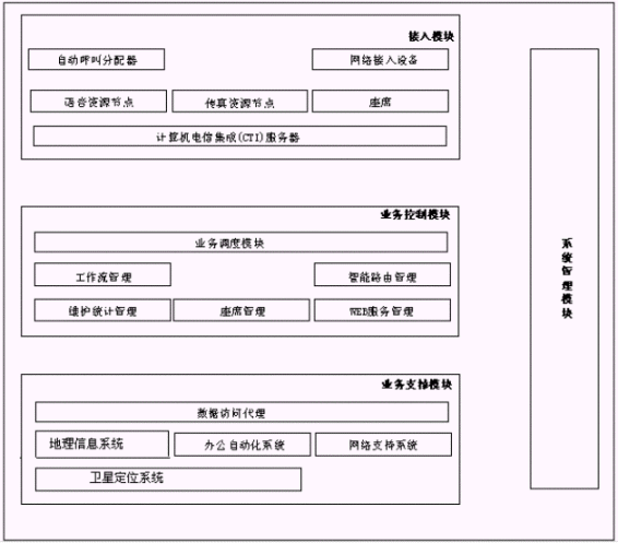 博宇110自動報警與指揮調(diào)度系統(tǒng)的邏輯結(jié)構(gòu)由以下四大模塊構(gòu)成:接入模塊、業(yè)務(wù)控制模塊、業(yè)務(wù)支撐模塊、系統(tǒng)管理模塊,如下圖所示。其中,接入模塊、業(yè)務(wù)控制模塊和業(yè)務(wù)支撐模塊構(gòu)成了整個系統(tǒng)軟件體系結(jié)構(gòu)的三個層次,而系統(tǒng)管理模塊則橫貫始終。
