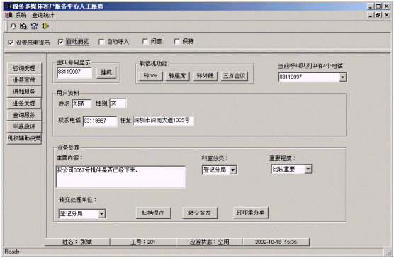 客戶打入電話后,當系統(tǒng)的自動語音應(yīng)答子系統(tǒng)無法解決納稅人問題時,客戶可選擇人工服務(wù),由客戶服務(wù)代表直接接聽納稅人電話,處理并解決納稅人問題。此時納稅人同座席話務(wù)人員直接溝通,并同時記錄下該客戶的聯(lián)系方式,將相關(guān)數(shù)據(jù)添加入系統(tǒng)數(shù)據(jù)庫;也可以在數(shù)據(jù)庫的支持下回答國家和地方的稅收政策及相關(guān)規(guī)定等的咨詢和疑問。客戶也可以選擇自動語音服務(wù)方式,根據(jù)系統(tǒng)的語音提示輸入按鍵,選擇類別,將自己的投訴和建議以及自己的聯(lián)系方式信息以留言錄音的方式保存在系統(tǒng)中。系統(tǒng)同時還支持自動傳真方式,客戶可以通過傳真機進入本系統(tǒng),通過按鍵選擇傳真方式,將自己的意見建議等的文本內(nèi)容傳真給系統(tǒng),系統(tǒng)自動接受并存入數(shù)據(jù)庫。