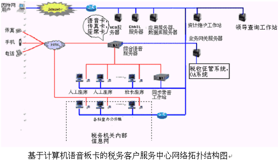 本系統(tǒng)提供基于計算機語音板卡和交換機兩種語音接入方式,都支持1號和7號信令線路的接入。對于20個以下人工座席的中小型稅務(wù)客戶服務(wù)中心系統(tǒng),則建議使用基于計算機語音板卡的方式,可以減少投資,同時具有良好的系統(tǒng)性能;對于大型的稅務(wù)客戶服務(wù)中心系統(tǒng),可選用排隊交換機作為語音接入設(shè)備,以保障系統(tǒng)的高可靠性和穩(wěn)定性。