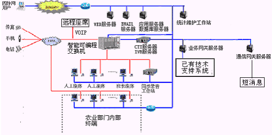 客戶利用電話、傳真、手機(jī)等撥打統(tǒng)一的特服號(hào)碼(如800XXX或9XXXX)或因特網(wǎng)進(jìn)入農(nóng)業(yè)分布式呼叫中心,本系統(tǒng)依托農(nóng)業(yè)部門各類計(jì)算機(jī)業(yè)務(wù)技術(shù)支持系統(tǒng)和網(wǎng)絡(luò)系統(tǒng),實(shí)現(xiàn)與農(nóng)業(yè)部門原有管理系統(tǒng)/業(yè)務(wù)系統(tǒng)及數(shù)據(jù)庫的無縫連接,通過人工受理或自動(dòng)語音服務(wù)等方式全天24小時(shí)不間斷地為客戶提供各種服務(wù)。