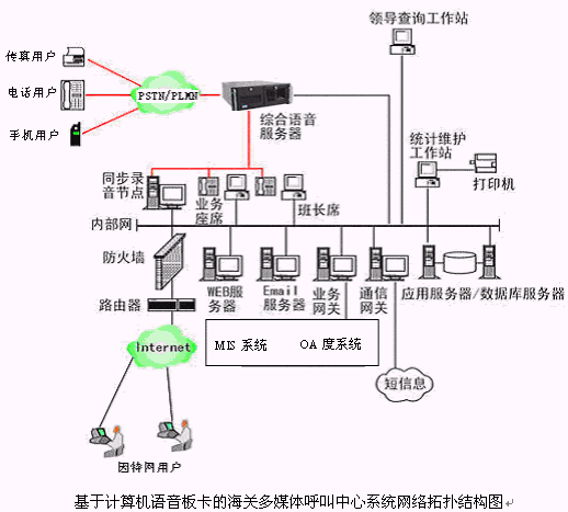 本多媒體呼叫中心的物理結構由帶語音板卡的高工控機、CTI服務器、IVR(交互式語音應答)/IFR(交互式傳真應答)服務器、業(yè)務代表座席(邏輯上分為:普通業(yè)務代表座席、專家座席、WEB座席等)、班長座席/質(zhì)檢座席、統(tǒng)計維護管理工作站、因特網(wǎng)(WEB)服務器、電子郵件(EMAIL)服務器、數(shù)據(jù)庫/應用服務器、錄音留言工作站、領導查詢工作站、業(yè)務網(wǎng)關服務器、通信網(wǎng)關服務器、網(wǎng)絡系統(tǒng)等和應用軟件構成。