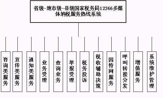 省級國家稅務局12366多媒體納稅服務熱線系統(tǒng)的業(yè)務功能結(jié)構(gòu)如下圖所示:
