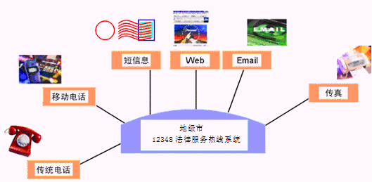 居民利用電話、傳真、手機(jī)等撥打某一特服號(hào)碼(如12348)進(jìn)入地級(jí)市法律服務(wù)熱線系統(tǒng),本系統(tǒng)依托地級(jí)市司法行政部門/法院各類業(yè)務(wù)技術(shù)支持系統(tǒng)和網(wǎng)絡(luò)系統(tǒng),通過(guò)人工受理或自動(dòng)語(yǔ)音服務(wù)等方式全天24小時(shí)不間斷地為人民群眾提供各種法律服務(wù);形成了對(duì)外服務(wù)于百姓的無(wú)形窗口,對(duì)內(nèi)管理、分析、決策系統(tǒng)相結(jié)合的多媒體呼叫中心。