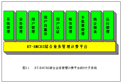 從系統(tǒng)接口角度,我們把RT-BNCBS綜合業(yè)務(wù)管理計費平臺分成9大子系統(tǒng),如圖4.1所示: