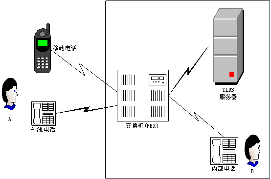 如圖1所示,在一個典型的應用環(huán)境里,TIDS系統(tǒng)可與公司或單位的電話交換機通過一條或若干條模擬電話線相連。未來TIDS的版本將可支持E1/T1數(shù)字中繼線?梢詫IDS設置為缺省的電腦話務員,即用戶呼叫直接由TIDS系統(tǒng)處理;也可以分配一個分機號碼給TIDS,當用戶需要時可撥該號碼使用TIDS服務。在后一種情況下,最好是在交換系統(tǒng)的問候語中提示用戶如何撥打TIDS系統(tǒng)。