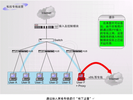 非法運營情況之二:如上圖中的F用戶作為運營商的合法包月用戶,上網(wǎng)服務(wù)開通以后,在自己的計算機中安裝代理服務(wù)軟件或者安裝路由器,這樣就可以隨時糾集若干住戶分攤包月費用,甚至私設(shè)網(wǎng)吧。