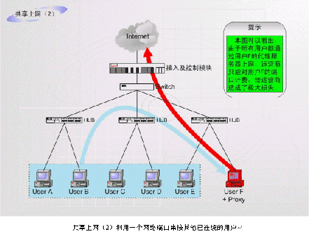 目前所知道的第一種非法運營情況:如上圖中的F用戶合法申請一根ADSL或其他線路然后在自己的計算機中安裝代理服務(wù)軟件或者連接一個路由器,就可以糾集若干住戶分攤該專線的租費,并通過該出口共享帶寬訪問外網(wǎng),而且他們同時還可以享受小區(qū)內(nèi)部網(wǎng)絡(luò)所固有的所有功能。