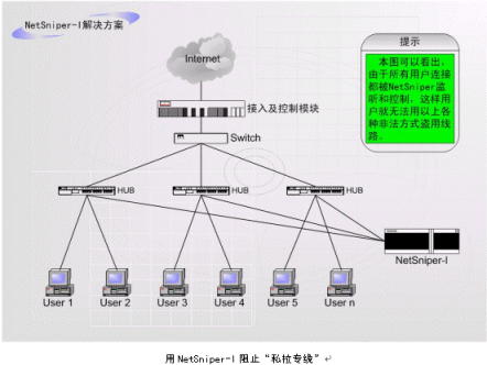 NetSniper-I適用于檢測和控制私拉專線。NetSniper-II適用于檢測和控制共享上網(wǎng)和盜用MAC地址上網(wǎng)。