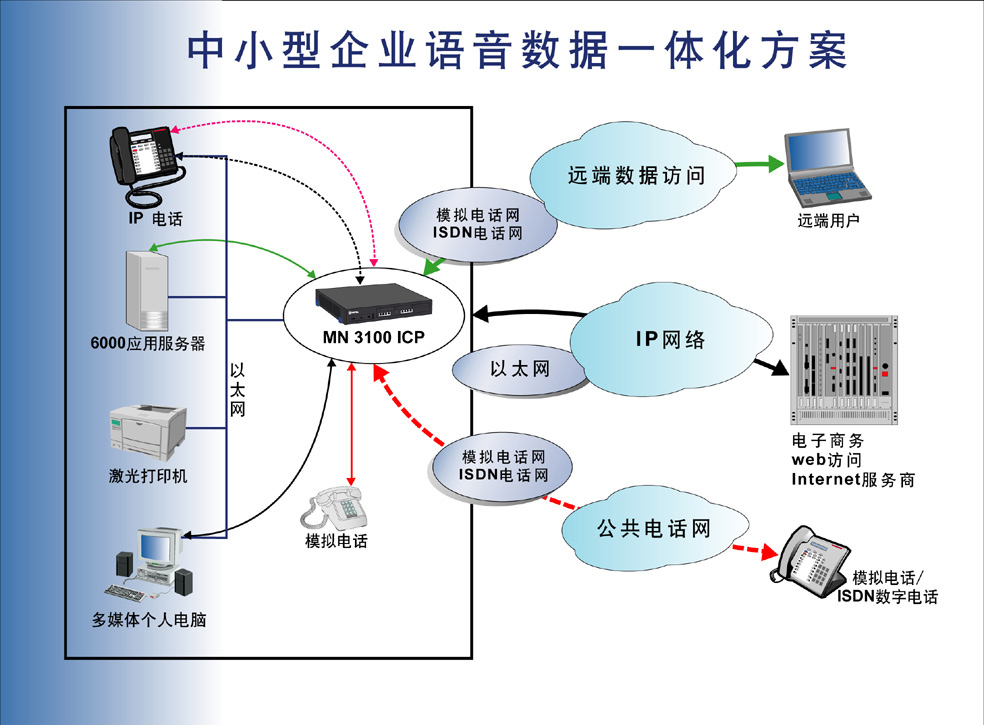 商務電話系統(tǒng)、本地網(wǎng)和網(wǎng)關集成在統(tǒng)一的平臺上?敏迪網(wǎng)絡推出的MN3100綜合通信平臺就是這樣簡單快捷的滿足您的需要,它是專為小型企業(yè)或大型企業(yè)的分支機構而設計的語音數(shù)據(jù)集成的解決方案。