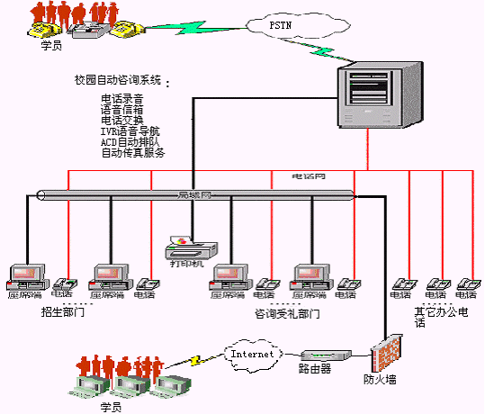 學員利用電話方式,可方便快捷的查詢教育培訓機構的介紹、開設課程情況介紹、教學地點情況介紹等信息。系統(tǒng)還可預置相關介紹內容的傳真件,供學員按需自助索取。