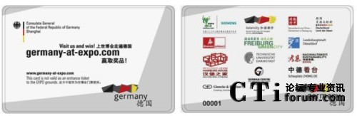 CTI論壇(ctiforum)5月17日消息(記者 潘婷婷):2010年5月,世人矚目的上海世博會已經(jīng)隆重開幕,德國館是其中的大熱門之一。想一睹德國館的風(fēng)采,一般都需要排2~3個小時的長隊。而觀眾可能不知道除了德國國家館外,德國還有多個城市在浦西的城市最佳實踐區(qū)展出。為了讓觀眾更好、更全面地體驗德國參展的所有活動,德國駐上海總領(lǐng)事館聯(lián)手智能卡領(lǐng)域的專家捷德公司共同推出了德國館智能參觀卡,觀眾只需持卡參觀德國的其他相關(guān)展區(qū)后,就可以不用排隊進(jìn)入德國國家館了。