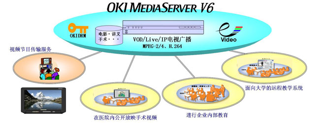 在OKI的通用視頻服務器系統(tǒng)上,將具有代表性的視頻傳輸功能作為標準服務要素,以解決方案的形式提供給用戶。以VOD(視頻點播)實時傳輸系統(tǒng)、中繼及監(jiān)視系統(tǒng)為代表,可以簡單便捷構筑靈活運用視頻及語音的豐富多彩的系統(tǒng)。URL:http://www.oki.com/jp/BMC/。