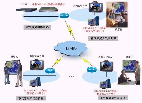 下圖為DSS-T.120數(shù)據(jù)會議服務(wù)器在某省氣象部門視頻會議系統(tǒng)中的典型應(yīng)用案例。