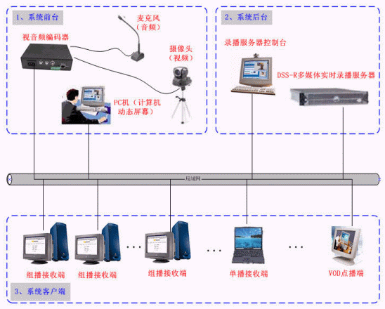 可通過(guò)單播或多播方式將現(xiàn)場(chǎng)的視頻、音頻、計(jì)算機(jī)動(dòng)態(tài)屏幕在網(wǎng)絡(luò)上進(jìn)行直播,客戶端可通過(guò)直播接收軟件接收到視頻、音頻、計(jì)算機(jī)動(dòng)態(tài)屏幕信息,采用組播方式時(shí)接收端數(shù)據(jù)沒(méi)有限制,可以在遠(yuǎn)程完整再現(xiàn)會(huì)場(chǎng)或教室的實(shí)況。