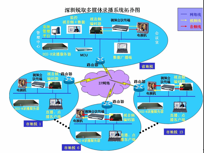 黑龍江省地稅采用了華為產(chǎn)品搭建了視頻會議系統(tǒng),實(shí)現(xiàn)了黑龍江省地稅和13個(gè)地市的電視電話會議功能,能夠?qū)崿F(xiàn)13個(gè)地市和省地稅之間的圖像、語音和數(shù)據(jù)的交互通訊,在此基礎(chǔ)上配置了銳取14臺DSS-R-C100多媒體錄播系統(tǒng)(省地稅與各市地稅各1臺),該系統(tǒng)可以輔助視頻會議系統(tǒng)完成視頻會議的錄制、直播和點(diǎn)播功能,錄制、直播和點(diǎn)播的內(nèi)容包括了主會場圖像、分會場圖像以及聲音和數(shù)據(jù)信號。