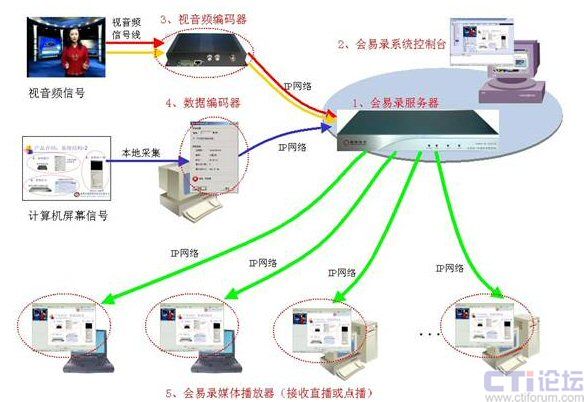 會(huì)易錄-多媒體錄播系統(tǒng)可安裝在主會(huì)場,通過視音頻編碼器接入主會(huì)場視頻會(huì)議終端輸出的遠(yuǎn)端/本地視頻及語音(VCR音頻接口)信號(hào),根據(jù)會(huì)議進(jìn)程會(huì)議管理員對MCU的進(jìn)行切換控制,視頻會(huì)議終端上會(huì)顯示出相應(yīng)遠(yuǎn)程會(huì)場的圖像及語音,視音頻編碼器即可該信號(hào)采集編碼后發(fā)送給會(huì)易錄服務(wù)器。會(huì)易錄服務(wù)器可和MCU,T.120數(shù)據(jù)服務(wù)器等設(shè)備安裝在后臺(tái)機(jī)房或控制室。在同步錄制數(shù)據(jù)內(nèi)容時(shí),可在發(fā)送雙流或參加T.120數(shù)據(jù)會(huì)議的PC安裝數(shù)據(jù)編碼器軟件采集計(jì)算機(jī)屏幕內(nèi)容,會(huì)議管理員只要通過會(huì)易錄系統(tǒng)控制臺(tái)連接上視音頻編碼器和數(shù)據(jù)編碼器后啟動(dòng)錄制功能即可,會(huì)議進(jìn)行中無需再進(jìn)行任何操作。會(huì)易錄以與會(huì)場切換相同的視角,“所見所錄”的模式對視頻會(huì)議進(jìn)程進(jìn)行忠實(shí)、全面的記錄,實(shí)用性強(qiáng),操作維護(hù)簡單,極大地降低了會(huì)議管理員的工作負(fù)擔(dān)。
