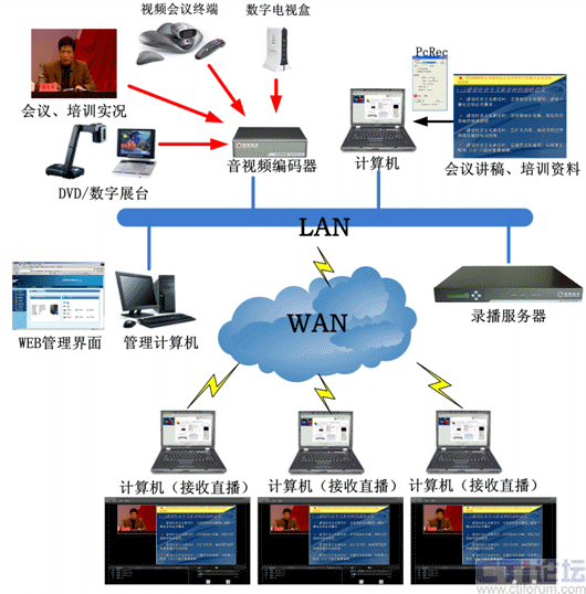 如上圖所示,會易錄采用前后臺分離模式,前臺設(shè)備(視音頻編碼器、數(shù)據(jù)編碼器)負(fù)責(zé)信號采集;后臺設(shè)備(多媒體錄播服務(wù)器)負(fù)責(zé)信號處理。前后臺設(shè)備之間通過IP網(wǎng)絡(luò)進行通訊。上述編碼器可將采集到的視音頻信號和計算機屏幕信號編碼后通過網(wǎng)絡(luò)發(fā)送到后臺的多媒體錄播服務(wù)器,多媒體錄播服務(wù)器可將收到的視音頻信號和計算機屏幕信號進行同步一體化的錄制、直播、點播。
