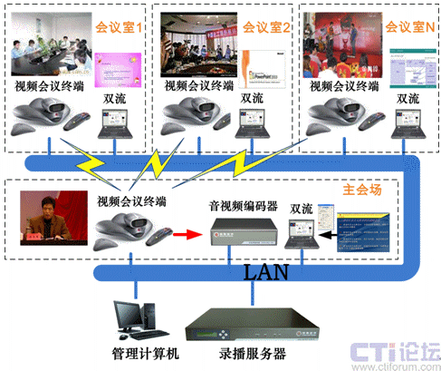 當(dāng)需要錄制沒有錄播的其他會議室實況時,通過主會場視頻會議終端呼叫任意會場的終端,即可錄制任意會場的會議實況,如下圖: