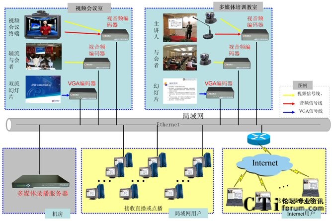銳取多媒體錄播系統(tǒng)采用了分布式的架構(gòu),前端的視音頻編碼器負責(zé)視音頻信號的采集,后臺的多媒體錄播服務(wù)器負責(zé)信號的錄制、直播和點播。多媒體錄播系統(tǒng)可從視頻會議終端上獲取信號,并將視頻會議實時直播到?jīng)]有視頻會議終端覆蓋的分行,擴大了視頻會議的參與范圍,讓更多的員工可以參加遠程培訓(xùn)。