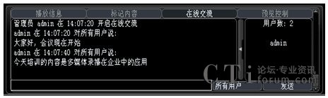 系統(tǒng)增加了多方文字互動交流功能,在線交流功能可以選擇給所有人員發(fā)送消息,也可以選擇給某一特定人員發(fā)送。這樣在會議或培訓(xùn)的過程中,管理員可以選擇性的提出相應(yīng)的問題給相關(guān)人員,考核相關(guān)人員的培訓(xùn)效果;其他人員也可以將會議或培訓(xùn)過程中遇到的疑問、難點及時的反應(yīng)給管理員進行解答,增強會議或培訓(xùn)的成效。