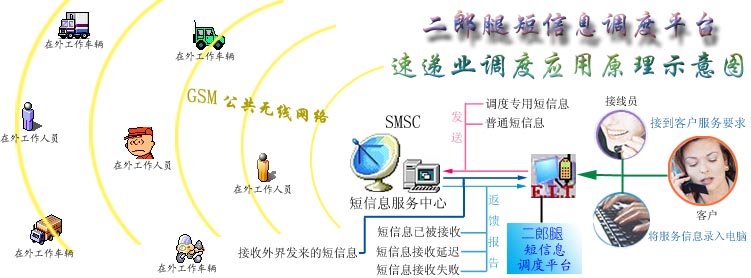 二郎腿短信息調(diào)度平臺是利用目前社會上大眾普遍擁有手機(jī)的現(xiàn)成資源,通過移動通訊公司提供的短信息服務(wù)功能作為通信信道,直接對手機(jī)進(jìn)行低層操作控制,以“收發(fā)短信息”的方式來實現(xiàn)信息的傳遞(通信資費標(biāo)準(zhǔn)與在手機(jī)上收發(fā)短信相同)。調(diào)度平臺還對每條發(fā)出的信息的接收狀態(tài)進(jìn)行跟蹤,確保信息能被安全
