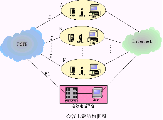 中:SPAS-2000作為組成會議電話平臺的主要交換平臺,Host作為業(yè)務(wù)管理平臺,它們共同組成會議電話平臺.A,B,N等作為使用會議電話平臺的用戶,它們有固定電話(作為會議電話使用),手機(jī)和電腦.它們均可作為某個會議電話的主持人.