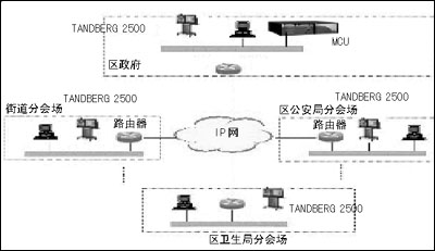 此次應用的視頻會議終端位于東城區(qū)政府所轄范圍內的各重要單位,通過H.323網(wǎng)絡召開內部工作會議,從而方便地實現(xiàn)實時交互式遠程會議,會議電視系統(tǒng)設計使用速率支持1.5Mbps,控制方式采用全網(wǎng)星型集中式控制方式。