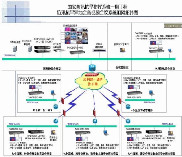 "工欲善其事,必先利其器"。為了推動(dòng)國家"金水工程"對(duì)信息化的要求,2003年,水利部就開始著手籌建國家防汛抗旱指揮視頻會(huì)議系統(tǒng)。按照當(dāng)初的項(xiàng)目規(guī)劃,這次視頻會(huì)議系統(tǒng)的建設(shè)主要包括水利部、7個(gè)流域機(jī)構(gòu)、31個(gè)。▍^(qū)、市)和4個(gè)重點(diǎn)工程局等43個(gè)單位的44個(gè)節(jié)點(diǎn)。