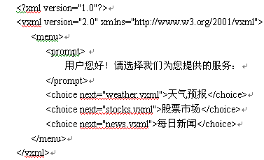 下面是一個(gè)VoiceXML簡單例子。當(dāng)用戶與電話語音系統(tǒng)接通以后,將會(huì)聽到語音合成的提示"用戶您好!請選擇我們?yōu)槟峁┑姆⻊?wù):" 。當(dāng)用戶說"股票市場"