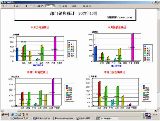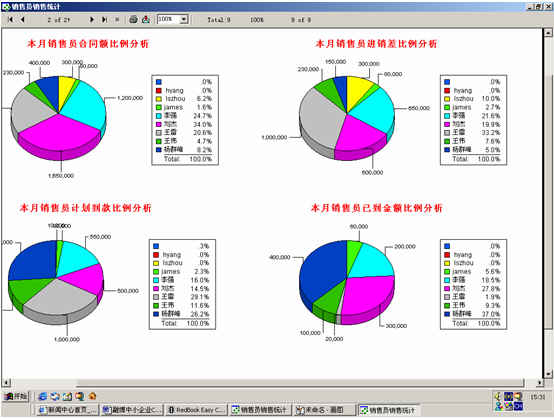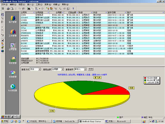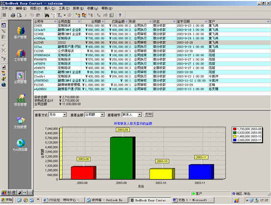 可對客戶(雇員)合同,根據(jù)合同階段、月份、合同金額、合同應(yīng)收應(yīng)付款、采購成本、客戶、銷售人員等條件進(jìn)行查詢和統(tǒng)計, 查詢統(tǒng)計結(jié)果以詳細(xì)列表及圖示進(jìn)行顯示。
