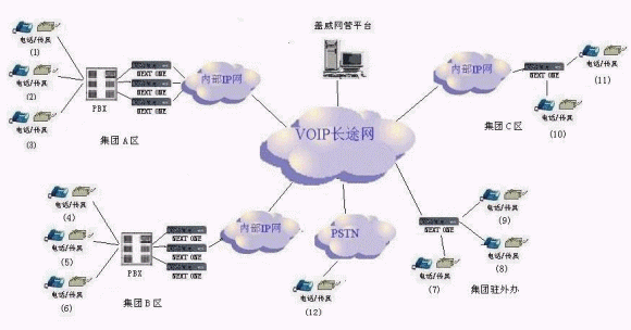 深圳市蓋威科技有限公司完整的語音解決方案如下,用一個網(wǎng)管平臺(AVS SERVER)來管理眾多企業(yè),各企業(yè)分支機構間可以實現(xiàn)相互通話免話費,另外將企業(yè)內部通話之外的電話通過網(wǎng)管平臺接入到電信營運商的VoIP